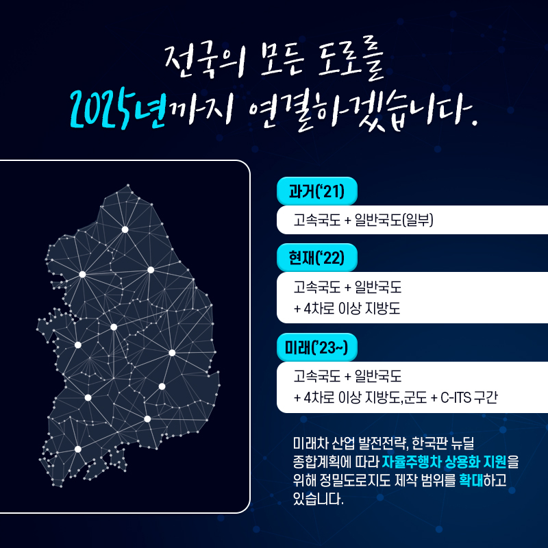 전국의 모든 도로를 2025년까지 연결합니다.미래차산업 발전전략 및 한국판 뉴딜종합계획에 따라 자율주행차 상용화를 지원하기 위한 정밀도로지도 제작범위를 확대하고 있습니다.