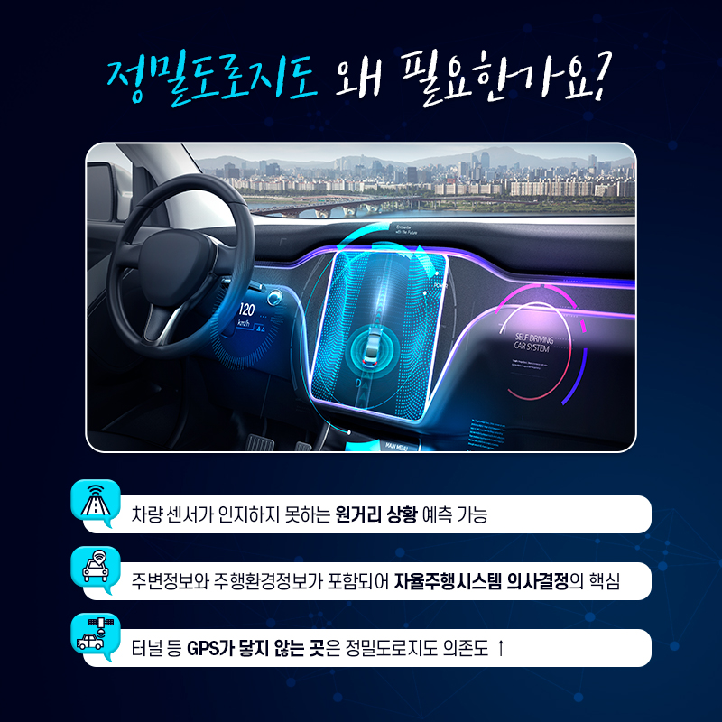 정밀 도로 지도가 왜 필요한 거죠?차량 센서가 인식할 수 없는 원거리 상황 예측 가능