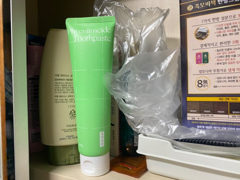 이런 생필품들은 외모나 패키지는 별로 신경 안 쓰는데 막상 화장실에 갖다 놓으니까 다른 아이템들과도 어울리더라고요.그리고 기존 치약과는 다르게 뚜껑을 열어보면 색다른 편백나무 향을 느낄 수 있었습니다.