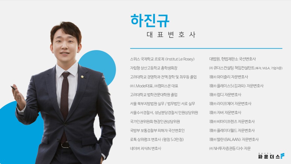 서울특별시 서초구 서초중앙로 156 2층 경영의 가장 중요한 결정을 함께 합니다! 안녕하세요, 법률사무소 파운더스의 대표변호사 하진규입니다.blog.naver.com