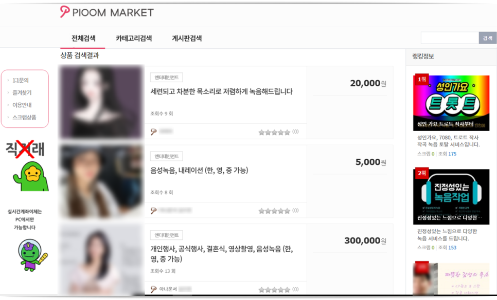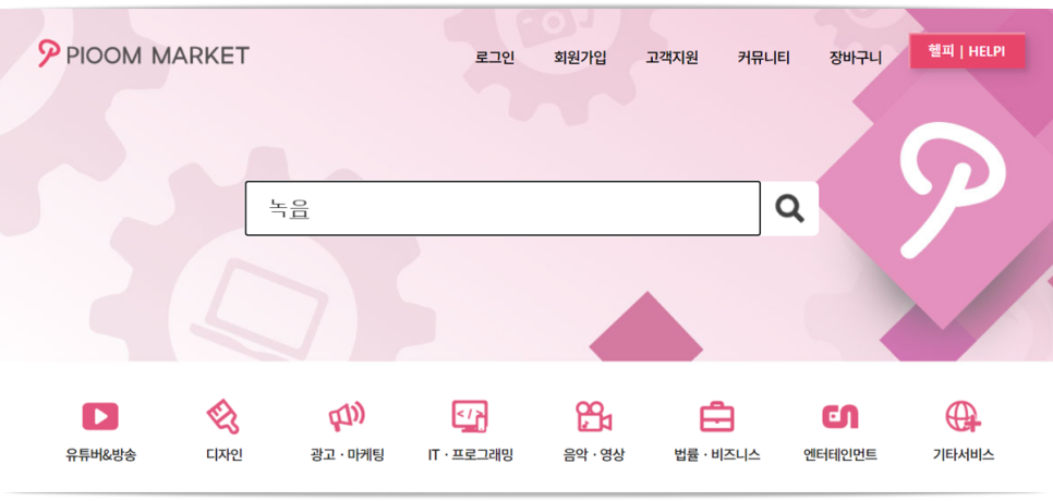 여러 가지 좋은 내레이션을 발견한 사이트는 빔 마켓이라는 곳이다. 처음 들어왔을 때의 화면이라 유튜버, 디자인, 광고, 법률 비즈니스, 엔터테인먼트 등 다양한 카테고리를 보면서 원하는 프리랜서나 전문가를 찾을 수 있지만 나는 최대한 빨리 알아보기 위해 ‘녹음’과 검새로 전문가를 쉽게 찾을 수 있었다.