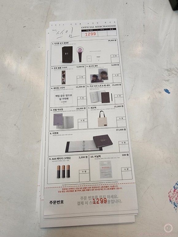 여기가 아닐까… 생각했는데 다른 분들이 뭔가를 쓰고 구입하셔서 가보니 굿즈 종류와 개수를 체크하는 표가 있더라고요.