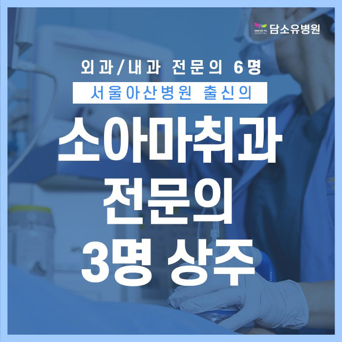 또한 진행에 있어서 가장 중요한 것은 마취에 대한 것입니다.담소유병원은 소아마취를 전문으로 하는 의료진이 상주하고 있어 안전하며, 서울아산병원 출신의 마취통증의학과 전문의 3명으로 어린이 한 사람 한 사람을 담당하여 집중적으로 진행해 나갈 것입니다.지속적인 모니터링을 회복할 때까지 계속하기 때문에 안전성을 우선으로 응급상황에 대비할 수도 있습니다.