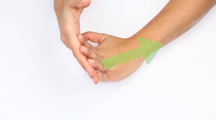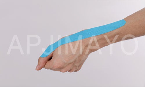 손목 한가운데서 서로 갈라지듯이 하나는 엄지손가락 방향으로 손바닥에 붙이고 다른 하나는 새끼 손가락 방향으로 붙입니다.※ 길게 잘라 손가락까지 덮어도 손목터널증후군으로 인한 통증을 감소시키는 기능에는 문제가 없습니다.3번 테이프를 붙이다.