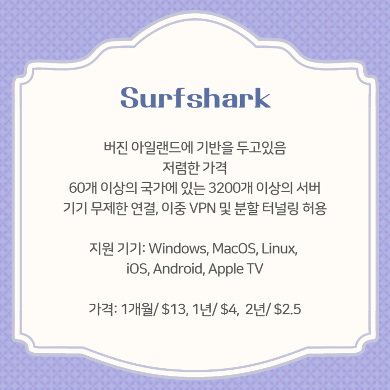 Surfshark는 가격면에서 이기는 서비스가 없습니다.저렴한 가격에 이용할 수 있으며 무제한 동시 접속이 가능합니다. 다른 유료 vpn 서비스의 가격이 부담스러운 분들에게 추천합니다.