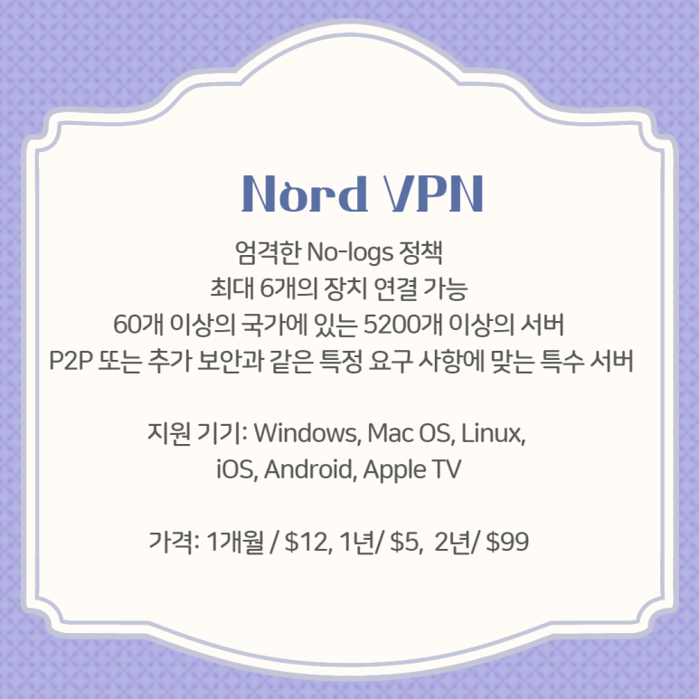Nordvpn은 무료는 아니지만 3개의 암호화 프로토콜(IKEV2/IPsec, OpenVPN 및 NordLynx)을 사용하여 개인정보 보호를 하고 있으며, 세계 59개국에 5,400개 이상의 서버를 제공하고 있으며,