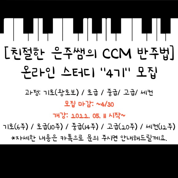 스터디 4기 모집 안내 – 강의 : 서은주 [공지사항][친절한 은주 선생님의 CCM 반주법] 온라인 안녕하세요 친절한 은주 선생님입니다.:) ‘친절한 은주 선생님의 CCM 반주법’ 교재를 구입하시는 분들이 많이 계십니다. 혼자 공부해보려고 구입했더니 생각보다 어려워서 포기하고 책장에 넣어두신 분들.. 주목해주세요!!