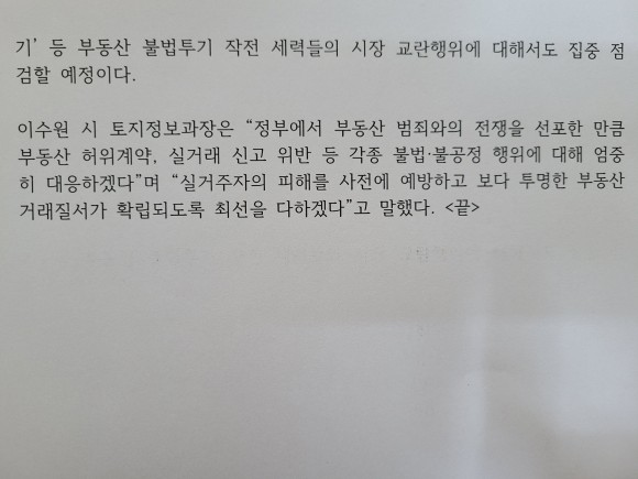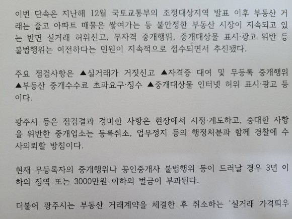 2020년 12월 국토교통부 조정대상지역 발표 이후 불안정한 부동산 시장이 지속되고 있는 반면 불법행위는 여전하다는 민원이 이어지면서 광주시와 5개 자치구 합동단속반이 편성됐다.