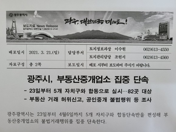 광주복공인중개사사무소에서 2021년 3월 23일부터 4월 6일까지 부동산중개업소 불법거래 행위를 광주광역시와 5개 자치구가 합동단속반을 편성하여 집중단속을 실시한다는 소식을 안내해 드렸습니다.