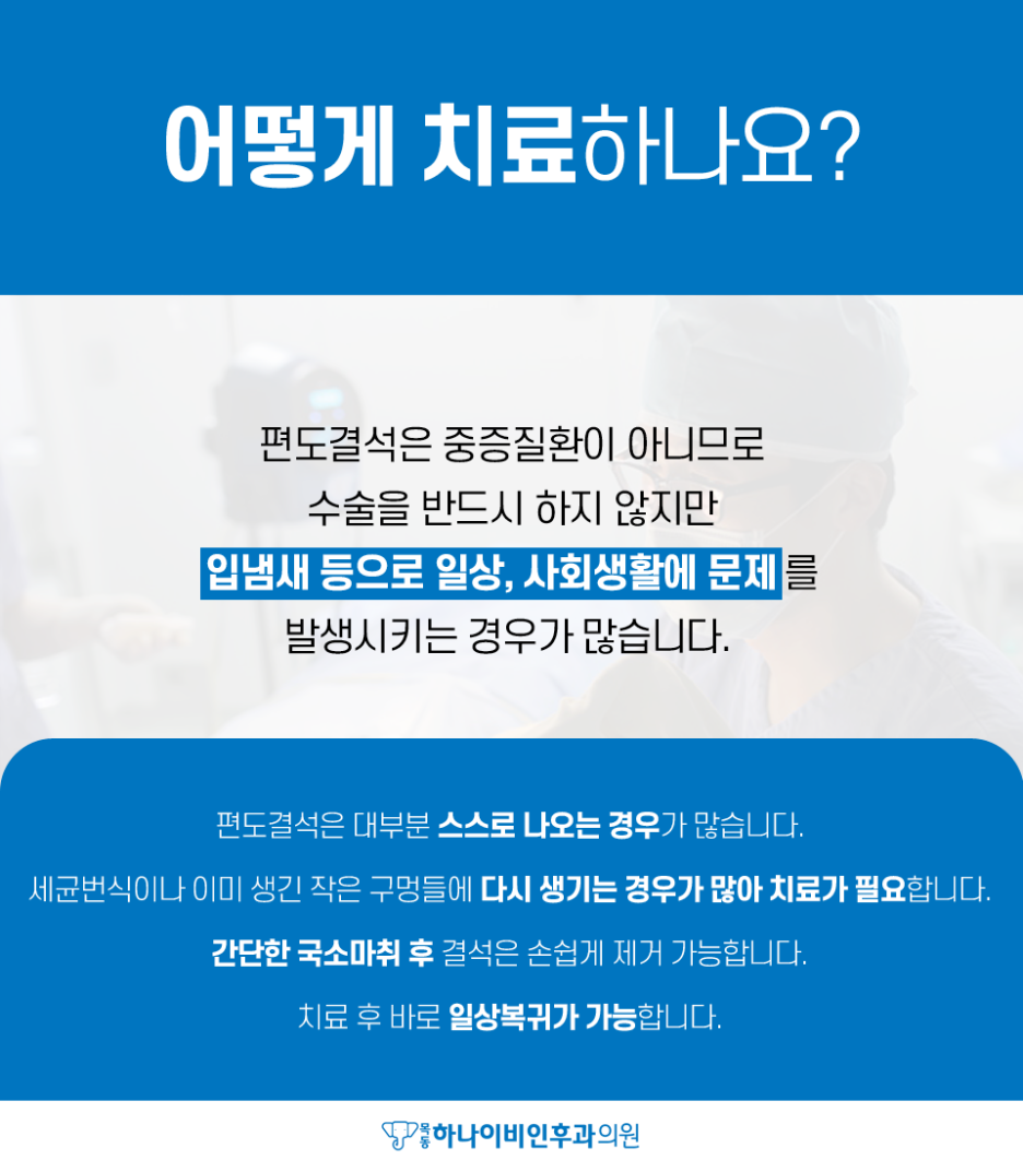 고주파로 간편해진 오목교역 편도 결석 치료 → 고주파 수술을 통해 편도 결석을 제거하는 오목교역 편도 결석 치료는 전신 마취가 아닌 목구멍 내부만 국소 마취 후 수술이 진행됩니다. 짧은 소요 시간과 함께 출혈이 적고 수술 후에도 일상 생활에 전혀 지장이 없을 정도로 회복이 빠르기 때문에 환자의 부담은 적은 것으로 알려져 있습니다.