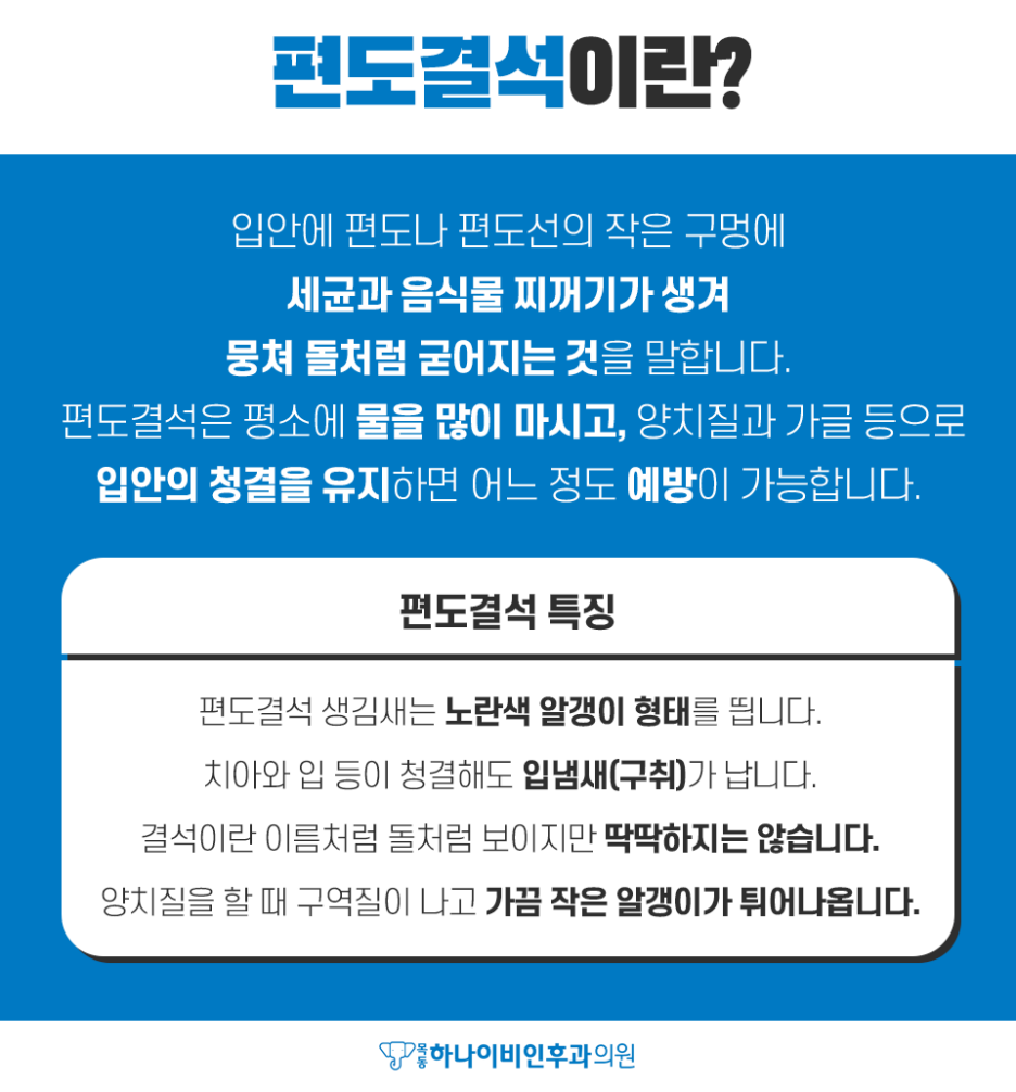 편도결석은 만성편도염으로 인해 가장 많이 발생합니다. 편도결석은 편도 또는 편도에 있는 작은 구멍에 음식물 찌꺼기나 세균이 모여서 생기는 쌀알 크기의 노란 알갱이를 말하며, 특별한 증상은 없지만 목이 아프거나 침을 삼킬 때 목에 뭔가 걸린 것 같은 이물감이나 귀가 아플 수도 있습니다.