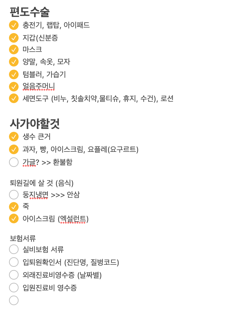 메모장에 적어놓고 위에 거로 가져갔는데… 얼음주머니를 단 한번도 사용한 적은 없지만 수술 당일에도 퇴원 후에도 텀블러도 가져갔는데 쓸 일이 없었고 둘 다 짐이 돼서 그냥 가져가는…