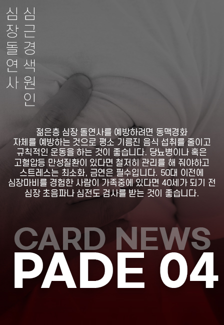 젊은층의 심장돌연사를 예방하기 위해서는 동맥경화 자체를 예방함으로써 평소 기름진 음식 섭취를 줄이고 규칙적인 운동을 하는 것이 좋습니다. 당뇨병 고혈압 등 만성질환이 있으면 철저히 관리해야 하며 스트레스는 최소화, 금연은 필수입니다.” 50대 이전에 심부전을 겪은 사람이 가족에 있다면 40세가 되기 전에 심장 초음파나 심전도 검사를 받는 것이 좋습니다.