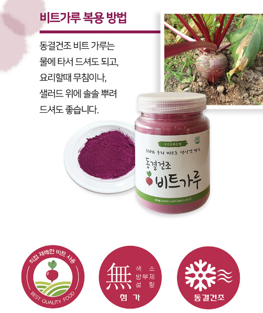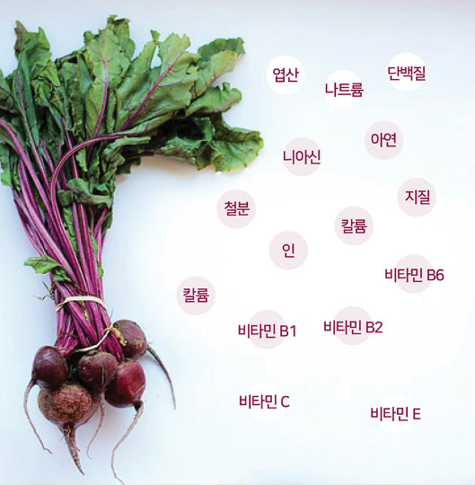 붉은색을 가지고 있는 레드비트는 적혈구를 생성하여 혈액조절에 도움을 주고 빈혈 예방에도 효과가 있습니다.레드비트는 단백질, 엽산, 나트륨, 니아신, 아연철분, 칼륨, 지질, 인, 칼륨, 비타민 B6, B1, B1, C, E 등 다양한 영양소가 풍부하게 함유되어 있습니다.
