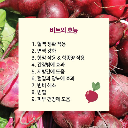 혈관 시미즈부에서 콜레스테롤 저하와 고혈압 완화 빈혈 예방, 혈액 순환에 도움이 됩니다.레드비트에 리코펜이 풍부하게 함유되어 있어 체내 활성산소를 제거하여 ‘염증완화’ ‘디톡스 효과’가 뛰어난 효능을 가지고 있어 비트 다이어트 식품으로도 인기가 있습니다.식이섬유가 풍부한 레드비트로 변비증 개선에도 효과가 있습니다.