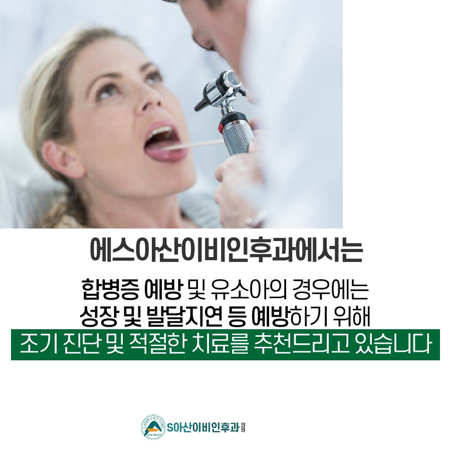 에스아산이비인후과에서는 편도선염의 오랜 방치로 인한 합병증을 예방하고, 유소아의 경우 성장 및 발달 지연까지 다를 수 있으므로 예방을 위해 조기진단 및 적절한 치료를 권장하고 있습니다.