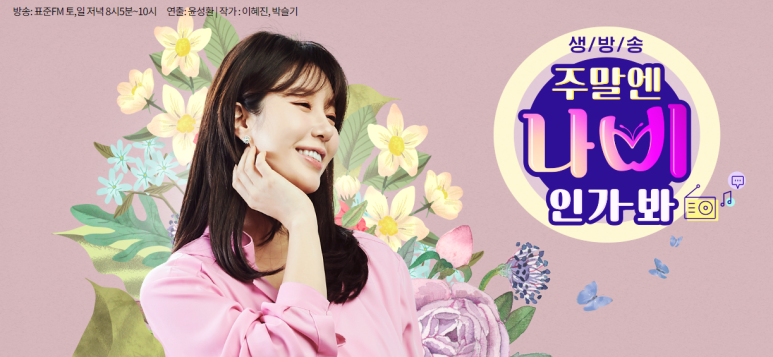 [주말은 나비같아] http://www.imbc.com/broad/radio/fm/weekn/corner/ 방송:표준FM 토,일 저녁8시5분~10시연출:윤성환|작가:이혜진,박슬기 주말은 나비같은 프로그램 메뉴 코너 소개 mini메시지 다시듣기 선곡표 사연과 신청곡 사진방 상품문의 매일코너 나 아직 집에 안갔어~!! 음악퀴즈! 나비가 사줄게~ 배너 영역 요일 코너 선곡! 나비효과 토요일은 나비다(토요일 토요일,나)일요일은 차트다 (일,다음) 코너소개 매일 코너소개 음악퀴즈! 나비가 소지호~… www.imbc.com 매주 토,일 오후 8시 5분부터 10시까지 MBC 표준FM(서울,경기 95.9MHz)에서 방송되고 있으니 앞으로도 많은 청취 및 시청 부탁드립니다!