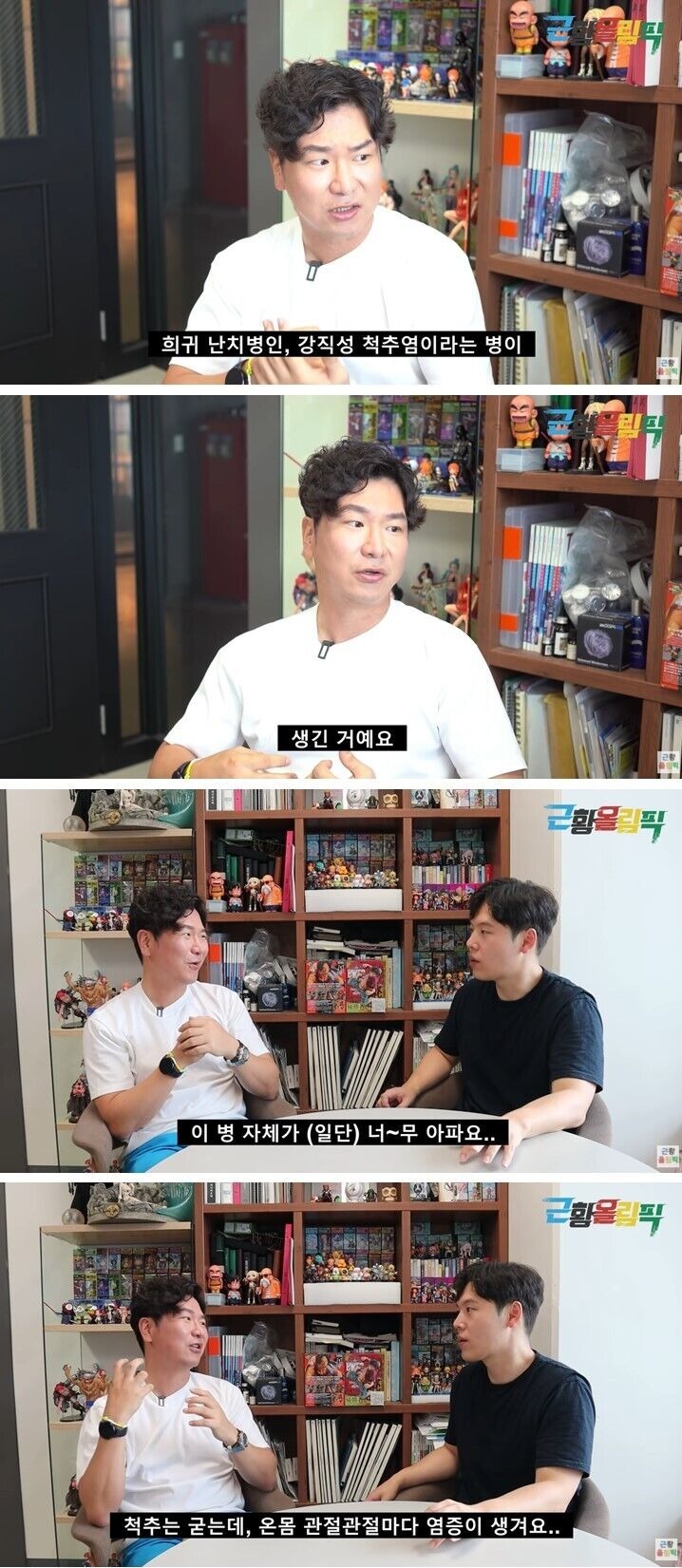 저는 아이의 아빠이고 아이를 키워야 하는데 등이 굽은 채 살아갈 생각을 하니 끔찍했어요. 그 뒤로 몸에 좋은 거 다 했어요. 술 담배를 다 끊고 제시간에 자고 제시간에 일어나서 약을 먹고 항상 운동했어요.그리고 ‘손가락 뼈가 굳어 있던 사람이 너무 많이 웃어서 열렸어’라는 말을 듣고 아무 이유 없이 계속 웃었어요. 살면서 그렇게 노력한 것은 아마 처음일 거예요.