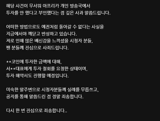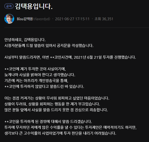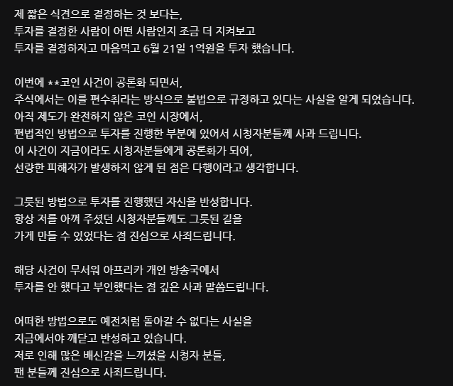 이 부분에서 문제는 주식과 비슷한데 주식과 달리 시세조종 시 아무런 처벌규정이 없는 코인을 상장 전 BJ가 투자해 홍보했다는 점이었는데요. 결국 코인 시세가 오르락내리락해 손해를 보는 건 시청자라는 점이 드러나면서 많은 팬들은 분노에 휩싸였습니다.투자하지 않았다고 밝힌 지 사흘 만에 입장 바꾸는 김택용의 거짓말