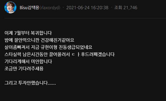 김택용은 지난 24일 자신의 아프리카TV 방송 게시판을 통해 공지를 남기고 “투자를 하지 않았다, 조만간 복귀를 준비 중이다”라고 글을 남겼는데요. 이 글을 본 많은 팬들은 “김택용은 믿었다, 역시 김택용” 등 믿고 있었다는 반응을 보였습니다.