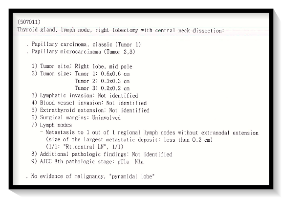 ‘Papillary carcinoma’는 갑상선의 유두상암종을 의미합니다. 조직 검사 결과지 아래에 보면 전이의 관련 내용이 기재되어 있을 것입니다.