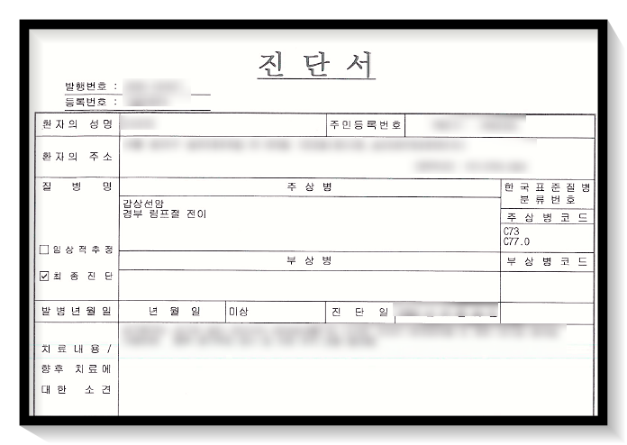 갑상선암(C73)과 전이암(C77) 코드를 동시에 부여받은 보험가입자의 진단서입니다.