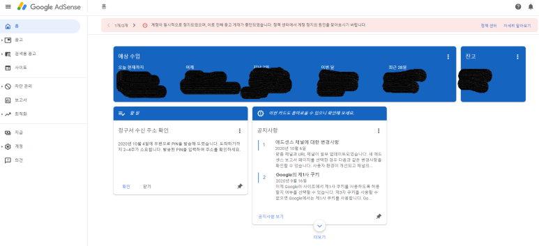 저렇게 빨간 글씨로 정지했다고 나와요그리고 구글 애드센스 가입 후 수익이 나면 PIN의 집 주소로 오게 되는데 그걸 등록하면 수익이 난다는 거! 알아두세요!주소 변경은 되는데 국가 변경은 안된대요.나라를 변경하려면 재가입을 해야 한다더군요!