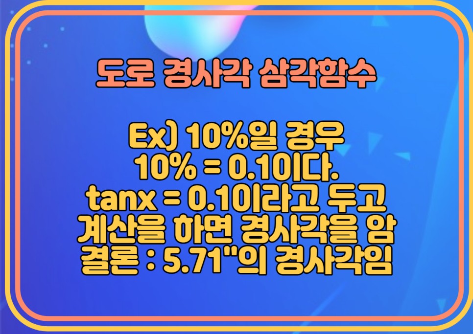 Ex) 10%인 경우 10%=0.1이다.tanx=0.1로 놓고 계산하면 경사각을 알 수 있습니다.