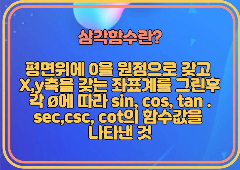 삼각함수란? 평면상에 0을 원점으로 하고 X, y축을 갖는 좌표계를 그린 후 각 Ø에 따라 sin, cos, tan.sec, csc, cot의 함수값을 나타낸 것이다.