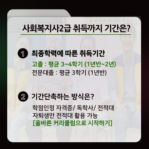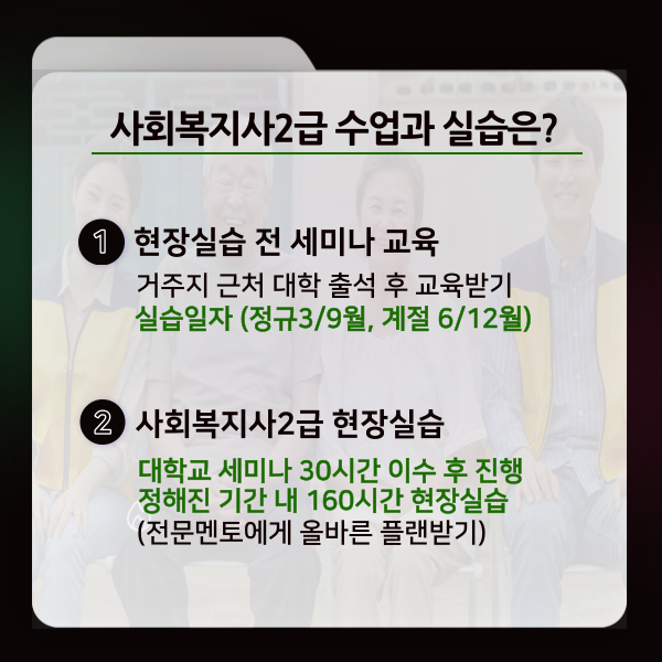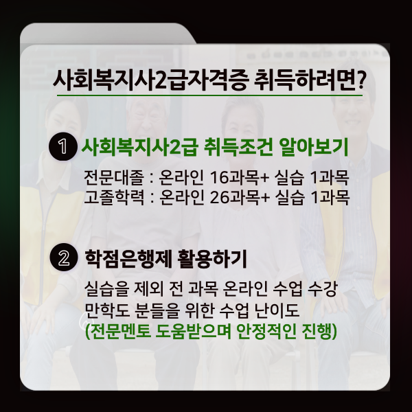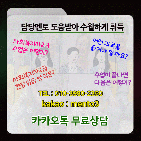 Q1. 사회복지사 자격증을 따기 위한 중년여용사회복지사를 위한 사회복지사 2급 자격증은 별도의 고시 없이 취득할 수 있습니다!