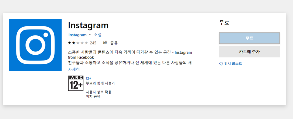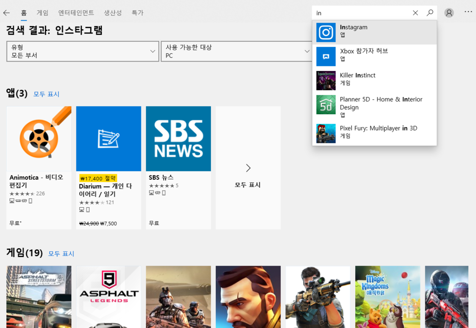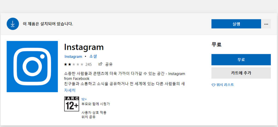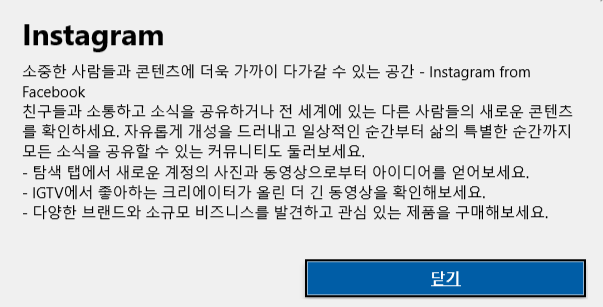 첫째 윈도10 전용 마이크로소프트 스토어 인스타그램 프로그램 설치 (사진 업로드 DM 전송 불가) (윈도10과의 호환성은 높음)