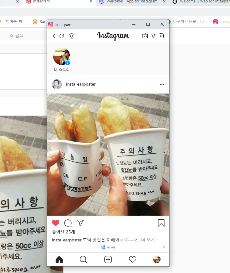 인스타그램 윈도우10 프로그램 실행 및 로그인 과정. 빠른 실행이 가능하지만 사진 스토리 쓰기는 불가.