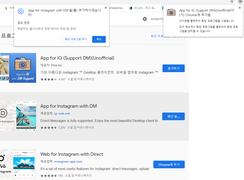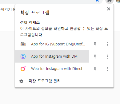 크롬 브라우저 오른쪽 상단에 실행할 수 있는 아이콘이 생성됩니다. app for instagram with DM을 눌러보세요.