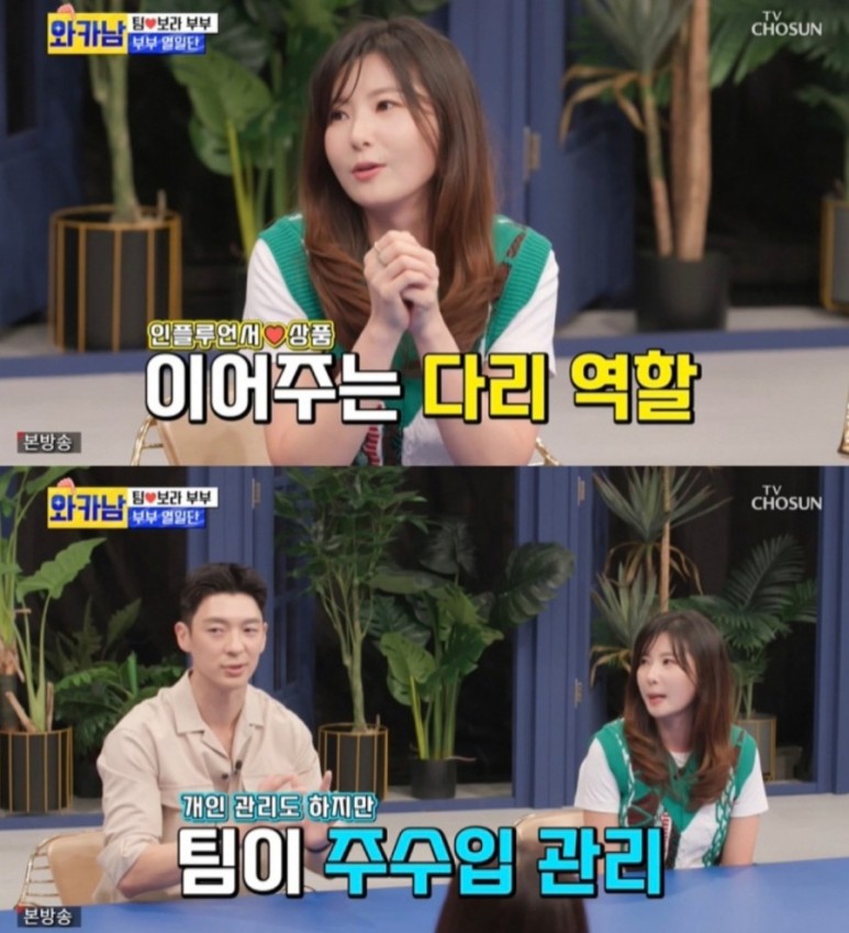 팀은 수입관리와 가사분담 질문에 따로 관리하되 메인은 내가 관리하겠다. 분리수거, 빨래 등을 하다. 좋아하기도 하고 보라와 함께하는 마음으로 한다”고 했고, 김보라도 가사 분담은 그때그때 상황에 따라 더 많은 사람을 돕는다고 덧붙였다.