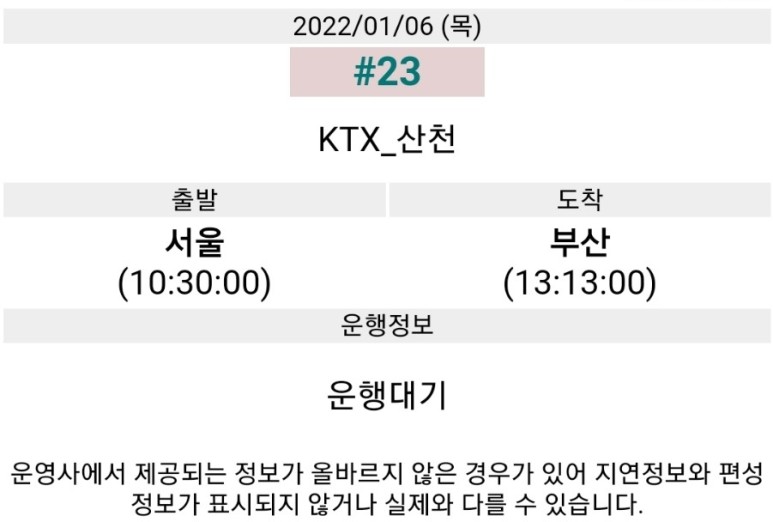 왼쪽에서 사고가 난 5일 23호 열차/운행을 마친 4일 23호 열차/6일 운행 예정이었던 23호 열차 운행 정보.출처 : 레일블루 사고가 발생한 열차는 10시 30분에 서울역에서 출발하여 13시 13분에 부산역에 도착하는 KTX-산천 23호 열차입니다.