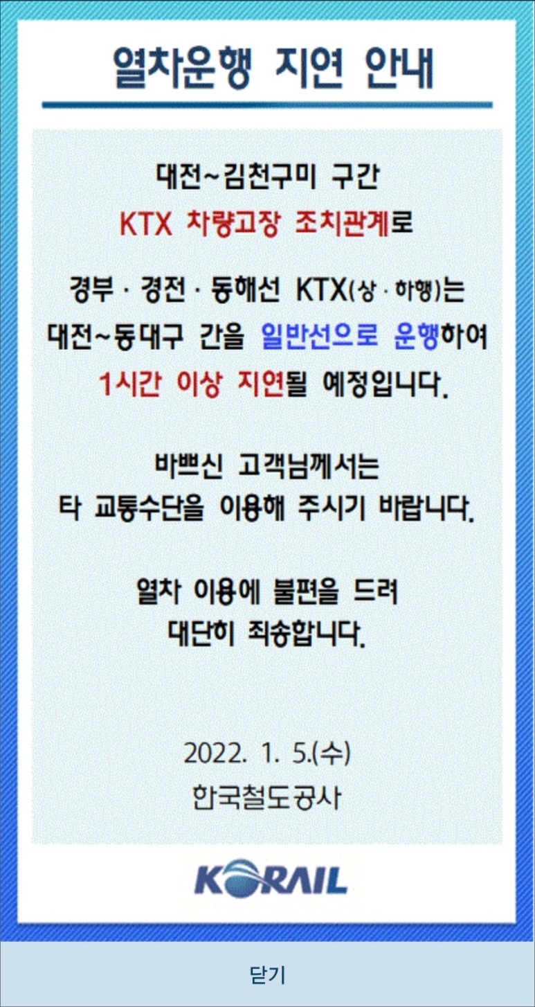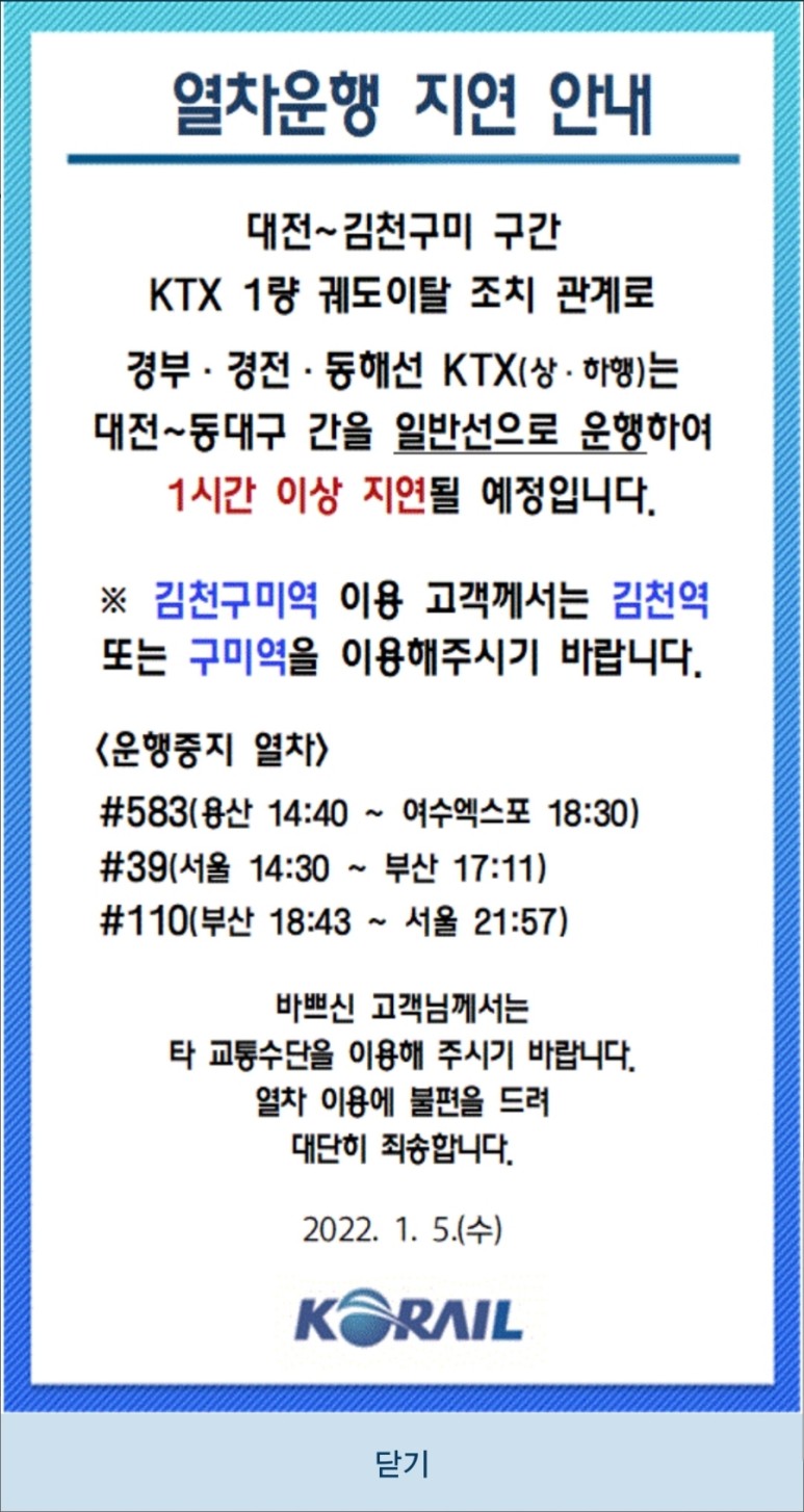 15시 30분경 현재 경부선·경전선·동해선에서 운행하고 있는 KTX 상행 열차는 대전~동대구 구간을 고속선이 아닌 기존선을 통해 우회하고 있으며, SRT도 기존선을 통해 우회 운행하고 있습니다.얘 왜 들려?m.dcinside.com 일부 열차는 김천역이나 구미역에 정차하고 있습니다.■ 3차 추가 정보 ■ 창문이 깨져 7명의 승객이 경상을 입었다고 합니다.현장 영상을 보면 불꽃이 튀고 창문이 깨지고…난리가 났네요.