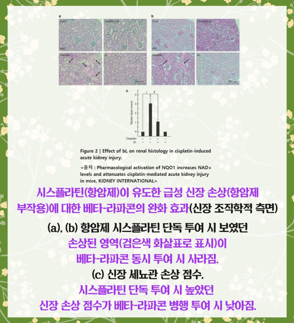 실제로 위 연구 자료를 보면 항암제 투여 시 단독으로 시행하는 것보다 해당 성분과 병행하면 신장 손상 정도가 낮아짐을 알 수 있습니다.