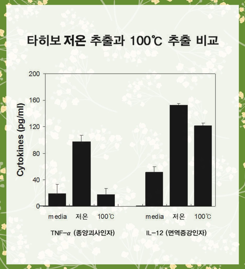 이러한 특성을 보완하기 위해 저온 추출을 적용하였으며 진행 후 면역 증강 인자와 종양 괴사인자 등을 포함한 추출 중 검출이 기존 고온 진행에서 최대 4~5배 높아졌습니다.