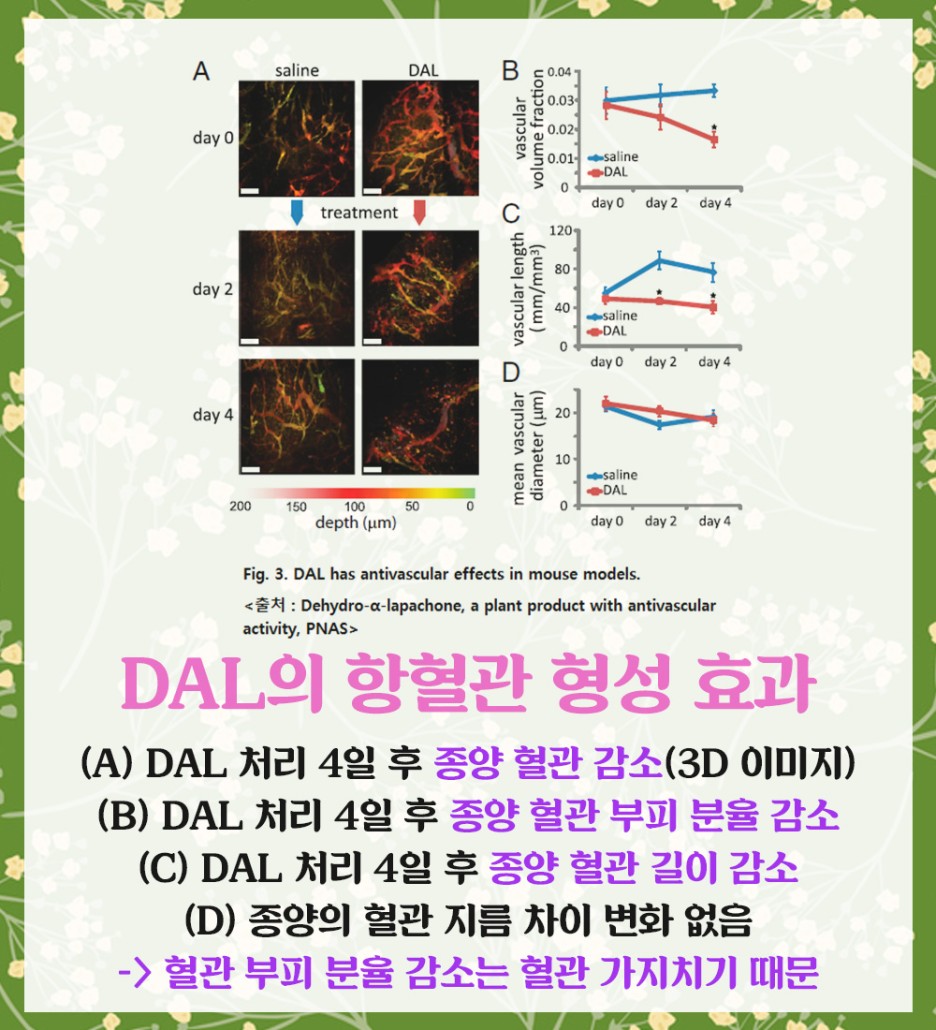 DAL은 이러한 신생 혈관의 생성 활동을 막아 암세포의 성장과 전이를 방해합니다.