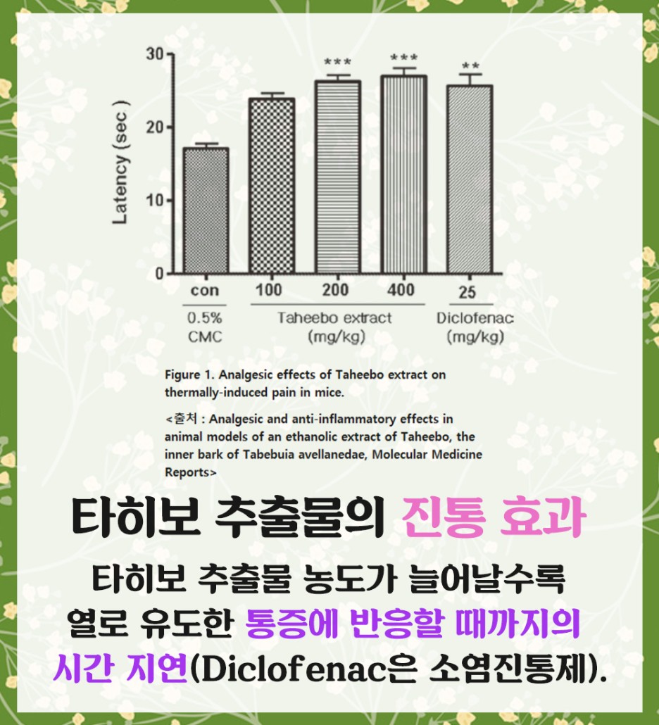 그 중 진통 소염 작용이 뛰어난 효과는 이 추출물과 일부 소염제를 비교한 후 실험을 통해 나타나고 있으며