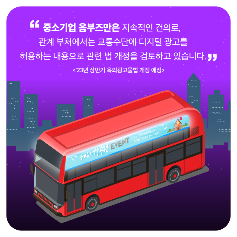 중소기업 옴부즈맨은 지속적인 건의로 관계부처에서는 교통수단에 디지털 광고를 허용하는 내용으로 관련법 개정을 검토하고 있습니다.2023년 상반기 옥외광고물법 개정 예정.