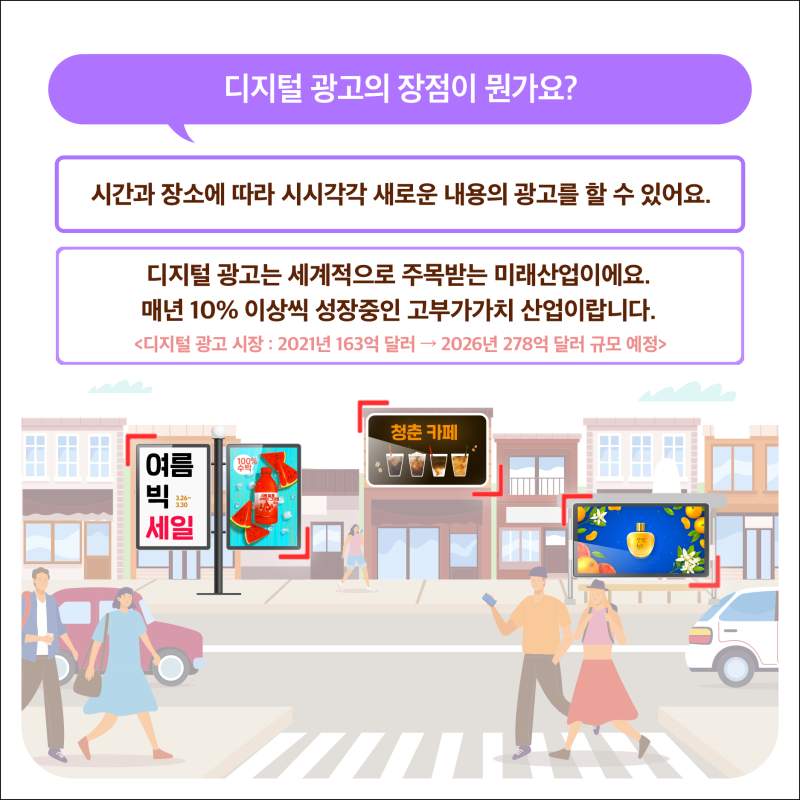교통수단에는 불가능했던 디지털 광고를 곧 버스에서도 볼 수 있는 디지털 광고의 장점은 무엇입니까?