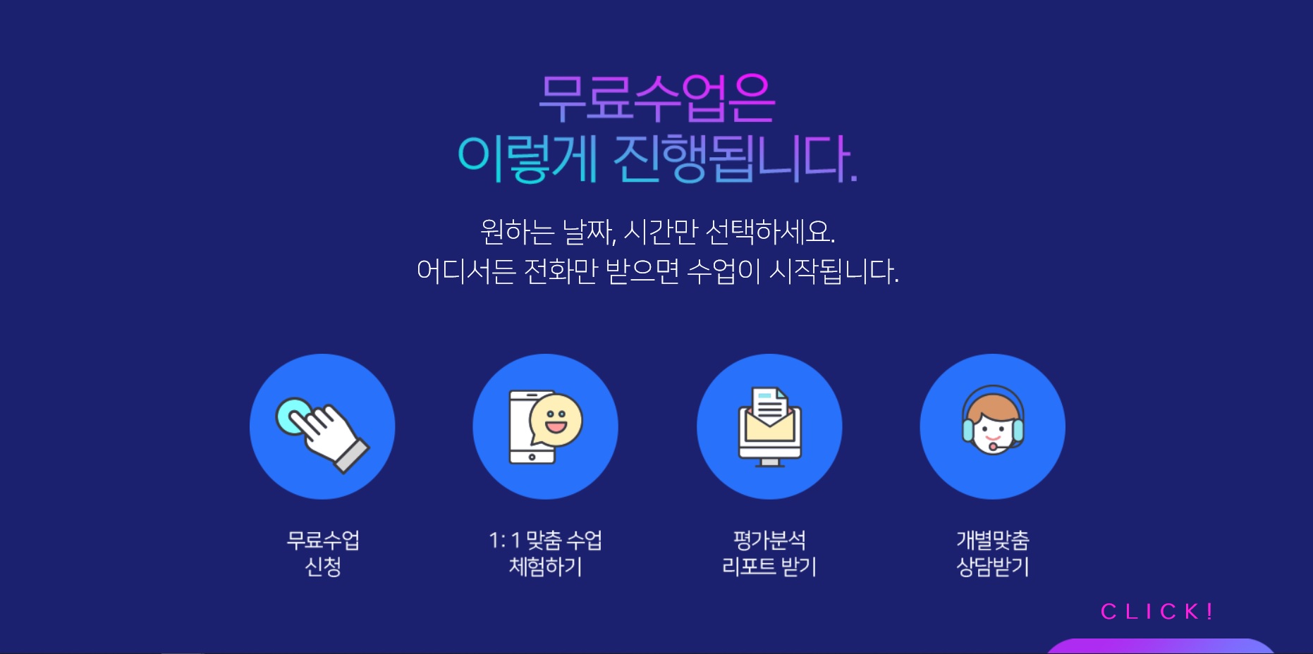 스마트폰에 설치하여 언제 어디서나 제한없이 시작할 수 있는 맞춤 회화과 탑!! 이제 외국어 학습을 시작하는 데 다양한 이유가 된 시간이 없기 때문에 장소가 적당하지 않다는 등의 이유는 말 그대로 변명일 뿐 목표를 달성하기 위해 꼭 필요한 학습이라면 지금은 쉽게 시작할 수 있는 1:1 화상 회화탑~