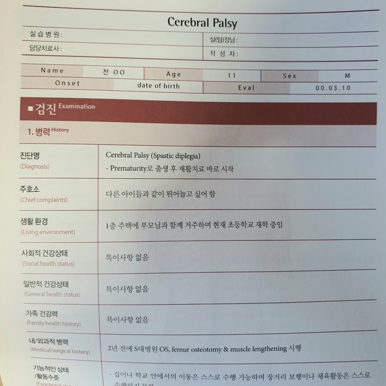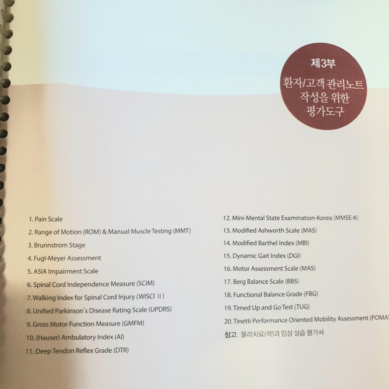 평가 도구가 뒤에 정리되어 있습니다솝 작성을 위해서는 환자 기능을 질환에 맞추어 직.접평가를 해야 돼요그때마다 인터넷에서 자료를 찾고 평가도구를 인쇄해서 정말 귀찮아요. ㅠㅠ ㅠ
