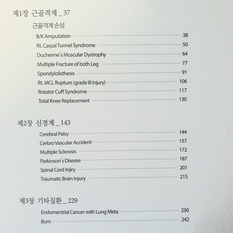 물리치료과 교수님들이 쓰신 책이에요각 질환별 소수 예가 나와 있습니다.