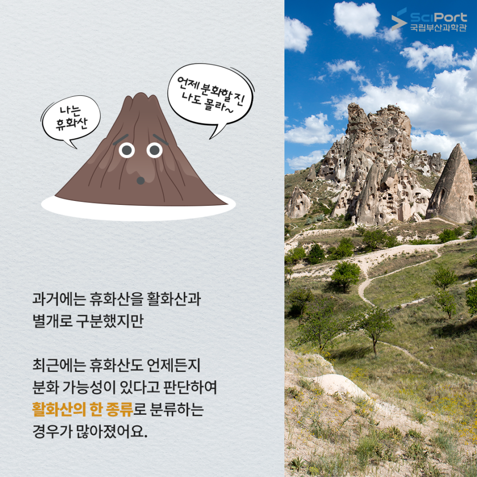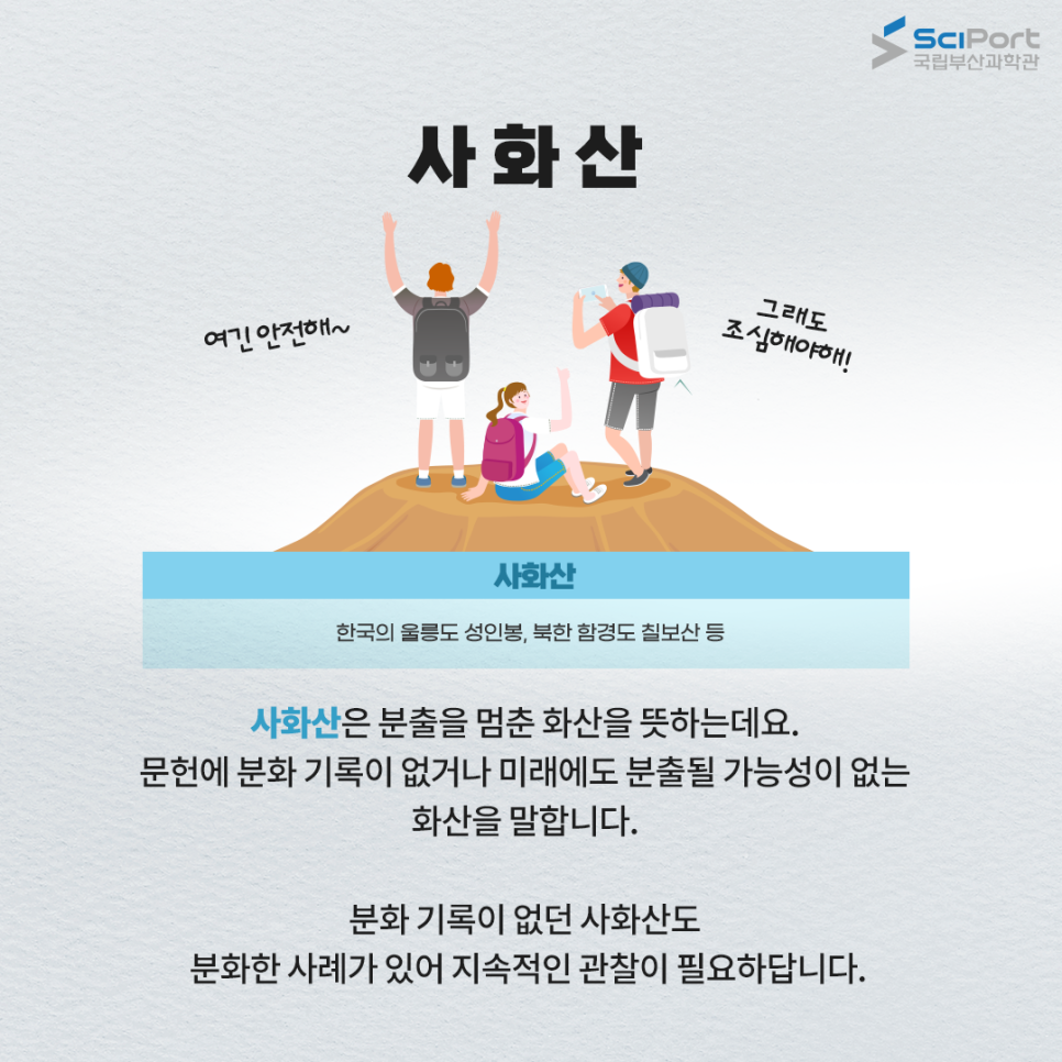사화산이란 분출을 멈춘 화산입니다.문헌에 분화 기록이 없거나 앞으로도 분출될 가능성이 없는 화산입니다.하지만 분화 기록이 없던 사화산도 분화한 사례가 있어서 지속적인 관찰이 필요합니다!