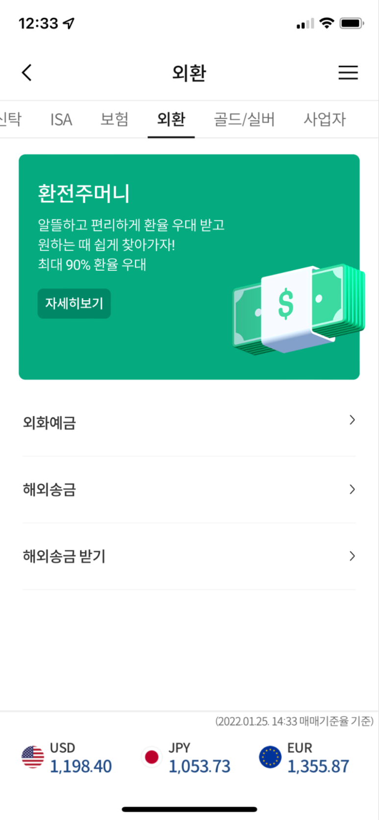 우리은행 원어플을 실행시켜 상품→외환을 누릅니다.