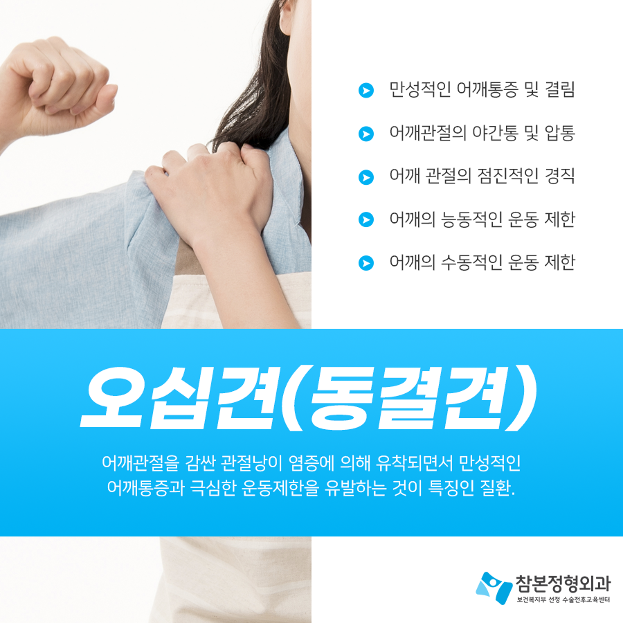 오십견은 50대에 흔히 볼 수 있다고 해서 붙여졌습니다.의학적 진단명으로는 동결 어깨 또는 유착성 관절 낭염이라고도 불리는 질환입니다. 어깨 관절 낭이 유착되어 만성적인 통증과 함께 팔을 올리기 어려워지는 운동 제한 증상이 특징입니다.