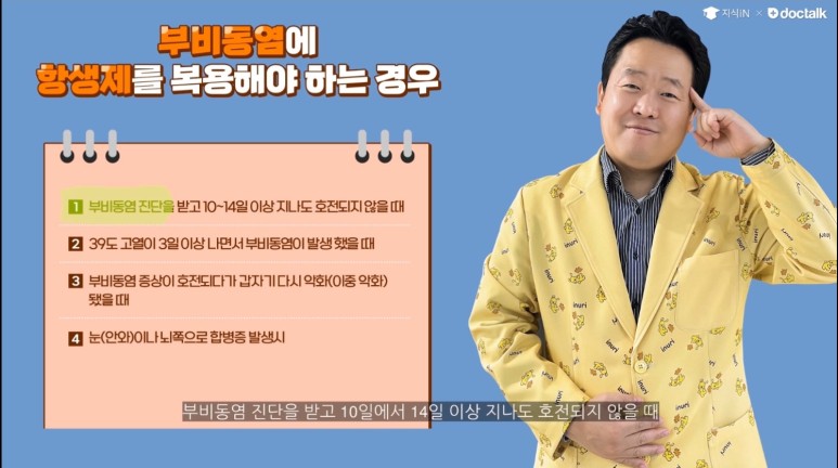 일부 축농증에 항생제를 복용해야 하는 경우 축농증의 대부분은 항생제를 복용하지 않아도 되지만 일부 축농증에는 항생제를 복용해야 하는 경우도 있습니다.①부비강염 진단을 받고 10~14일 이상이 지나도 좋아지지 않을 때 ②39도 고열이 3일 이상 나고 부비강염이 발생했을 때 ③부비강염 증상이 호전되었다가 갑자기 다시 악화되는 이중악화가 있을 때 ④눈이나 뇌에 합병증이 발생했을 때는 항생제를 복용하세요.