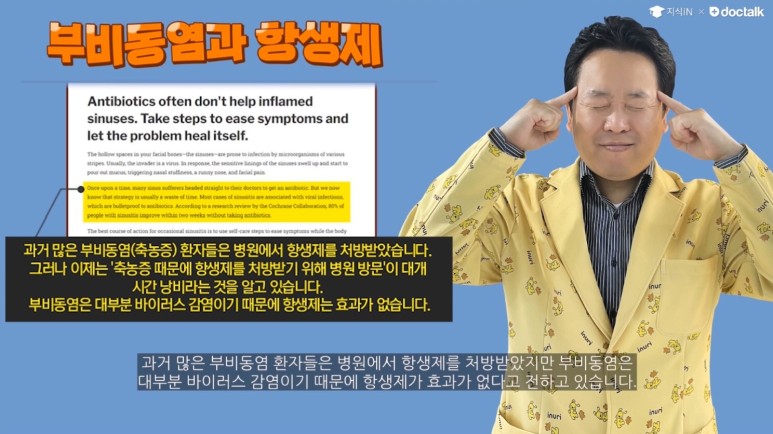 14년째 진료실에서 벌어지고 있는 해프닝: 축농증인데 항생제 안 먹어도 된다구요?진료실에서 환자나 보호자가 감기에는 항생제를 먹지 않아도 된다고 하니 많은 분이 수긍하는 편입니다.하지만 급성 축농증, 즉 부비강염이므로 항생제를 먹지 않아도 된다고 하면 대부분 다시 묻습니다.축농증인데 항생제를 안 먹어도 된다고요?급성축농증의 대부분은 감기처럼 바이러스가 원인이기 때문에 항생제는 효과가 없습니다.오히려 항생제 오남용은 건강에 심각한 해가 됩니다.좀 더 자세히 설명해 드리겠습니다.